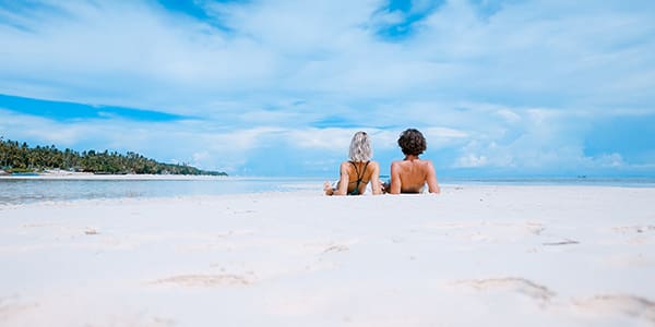 A tropical beach scene with turquoise water, people swimming, palm trees lining the shore, and a mountain rising in the background under a partly cloudy sky.