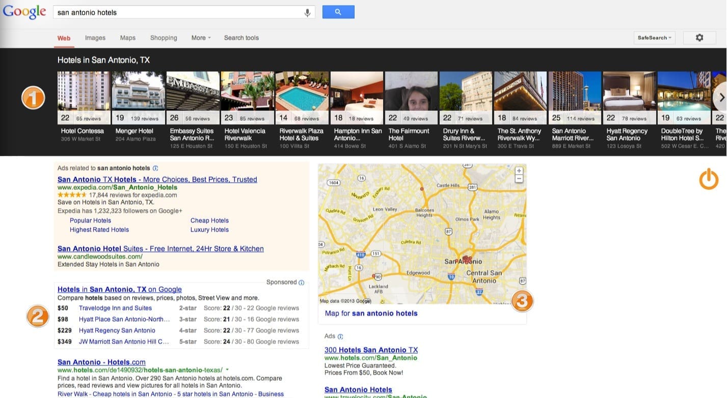 The Google Knowledge Graph carousel is now showing up more and more. And across a much wider variety of categories and verticals. Launched around 10 months ago, the new look definitely stands out more by giving more contrast to the images. The screen shot below is for results relating to hotels. While the carousel isn’t new, it’s updates and increased frequency aligns with their recent beta rollout of AdWords Image Extensions.This result for “san antonio hotels” in fact tells a more telling story for hospitality. Not only does the carousel appear (1), but local results have vanished. In addition still, expanded set of HotelFinder results appear directly underneath the top PPC ads (2). Then to add some further displacement at the top of the page, the map pushes down the side paid ads somewhat more. So now, organic placements start much further down the page. No sense at the minute on how frequently the new format is appearing but the resulting placements in the page and removal of “traditional” local SERPs will have an impact on traffic flow for those hotels happily taking their slice of traffic from this highly competitive search term and other geo-modified hotel and resort terms.